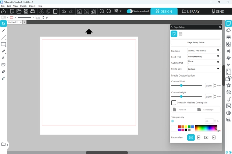 付属のデザインソフトウェア Silhouette Studio において、使用するメディアサイズや台紙の有無を設定するとカット可能範囲が赤い枠で表示されるので、一目でカット可能範囲が確認できます。