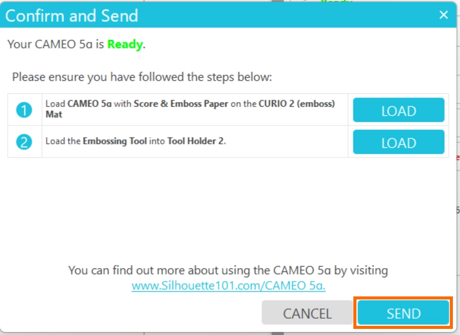 メディアをロードしたか、エンボスマットをセットしたか、ツールホルダー2にエンボスツールをセットしたか確認し、[送信]をクリックするとエンボス加工が開始されます。