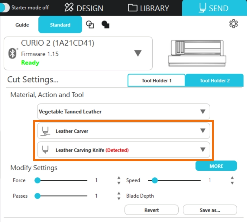 4. マシンとパソコンを接続するとレザーカービングナイフが自動的に検出され、[送信]パネルのツールホルダー2にアクションとツールが表示されます。