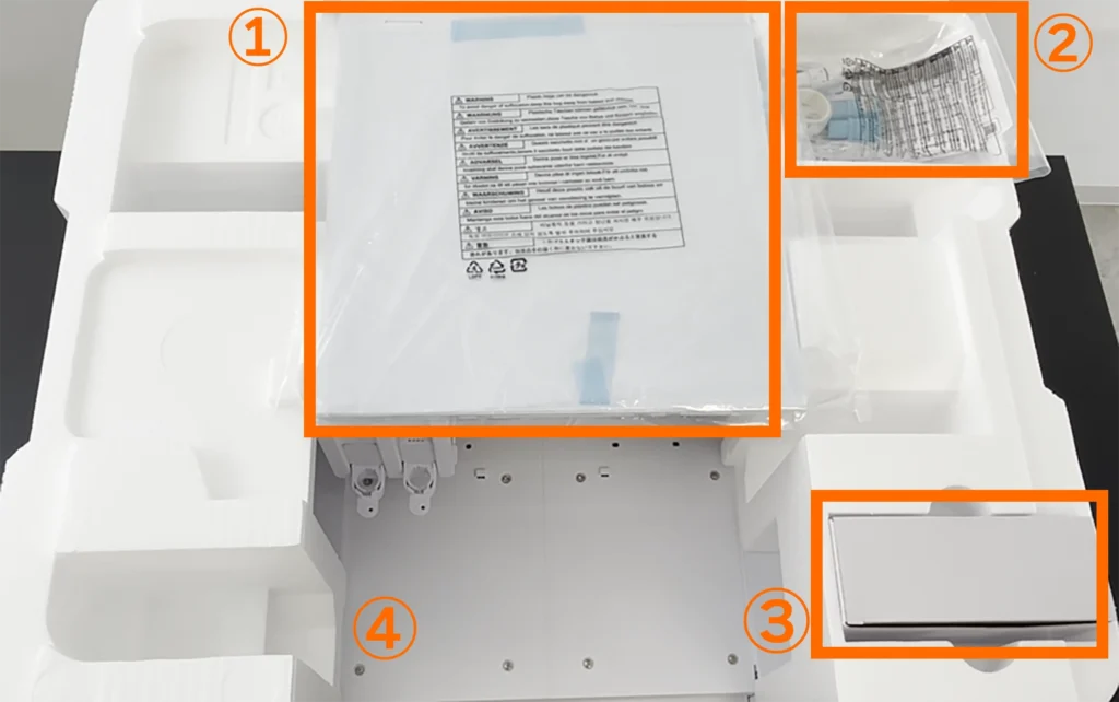 3. バーを固定している緩衝材③④を取り外します。