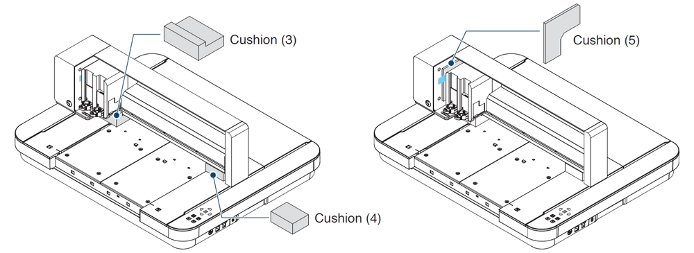 ツールキャリッジを少し右に移動させてから、テープで固定されている緩衝材⑤を取り外してください。