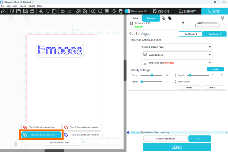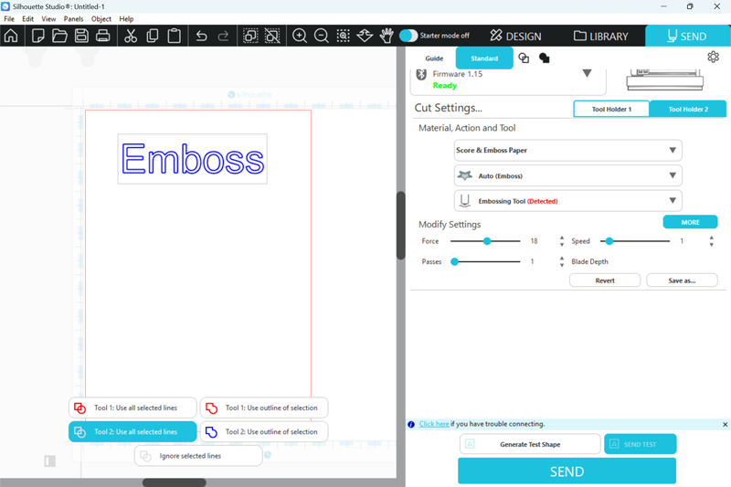 8. エンボス用のデザインファイルをSilhouette Studioで開き、[送信]パネルを開きます。
