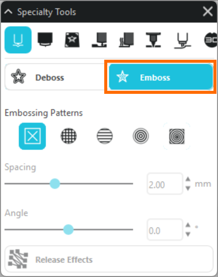2. [特殊ツールパネル]の[エンボス/デボス]タブを開き、[エンボス加工する]を選択します。