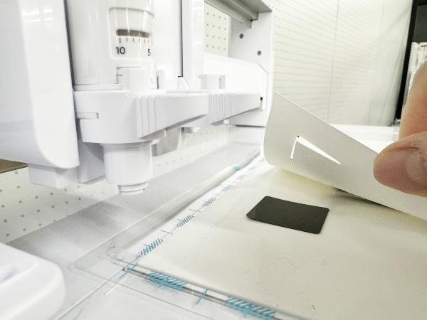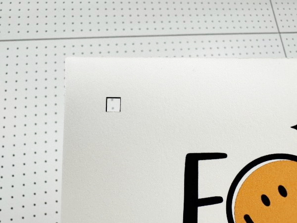 11. トンボが切り抜かれた位置(3か所)の下にトンボシートを挟んでトンボが黒く見えるようにし、メディアを押さえてしっかり固定します。