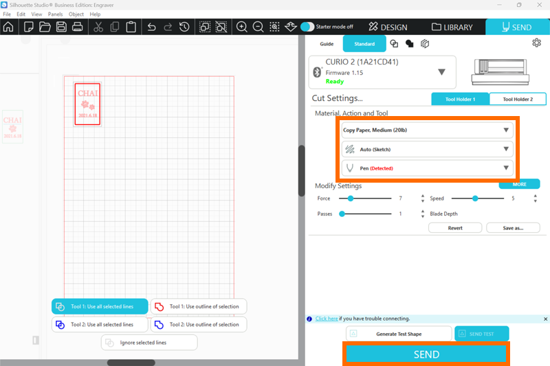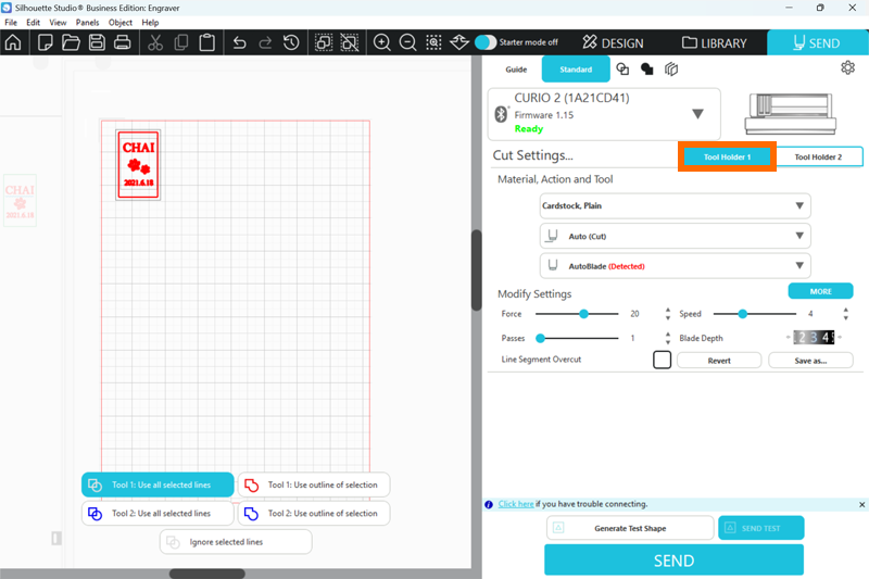 5. Silhouette Studioの[送信]パネルに移動し、ツールホルダー1のタブを開きます。