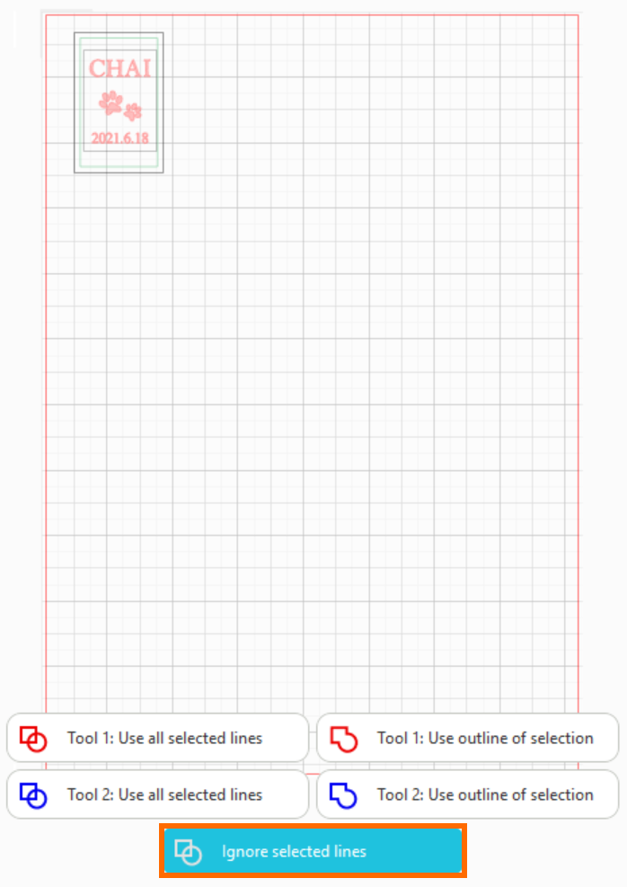 6. 全てのラインを選択して「選択した線を無視」をクリックし、その後位置合わせ用の枠のラインだけを選択して「選択したすべての線を使用(赤)」をクリックします。