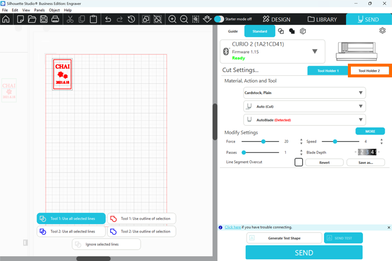 8. Silhouette Studioの[送信]パネルに戻り、ツールホルダー2のタブを開きます。