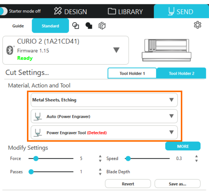 10. メディアに[メタルシート、エッチング]、アクションに[パワーエングレイバー]、ツールに「パワーエングレイバーツール」が選択されていることを確認して[送信]をクリックします。