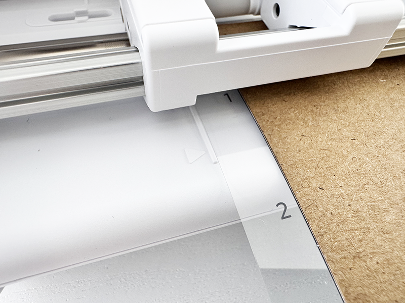 2. カッティング用台紙の左端をフロントパネルのガイドラインに合わせ、先端をピンチローラーに突き当てます。