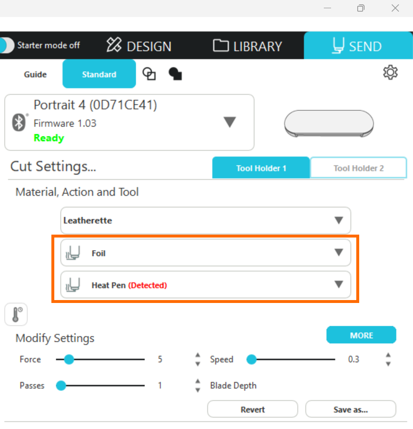 4. マシンとパソコンを接続するとヒートペンが自動的に検出され、[送信]パネルのツールホルダー1にアクションとツールが表示されます。