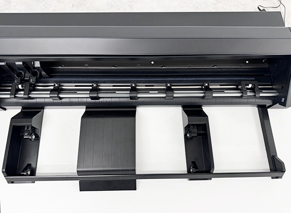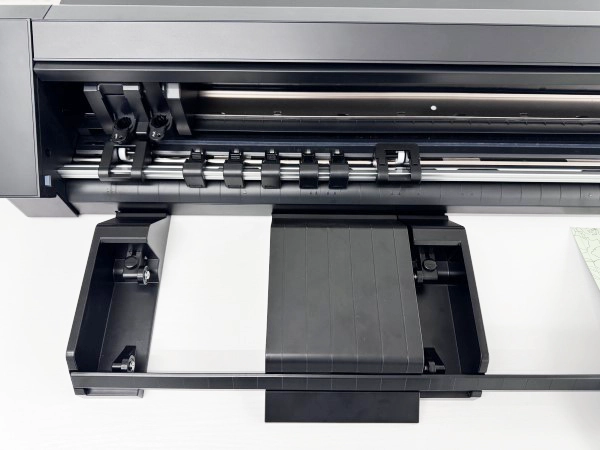 2. ピンチローラーユニットのレバーを上げて左右に動かし、メディアの幅に合わせてローラー位置を変更します。