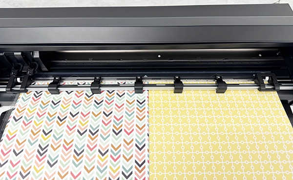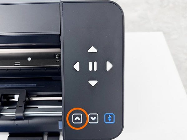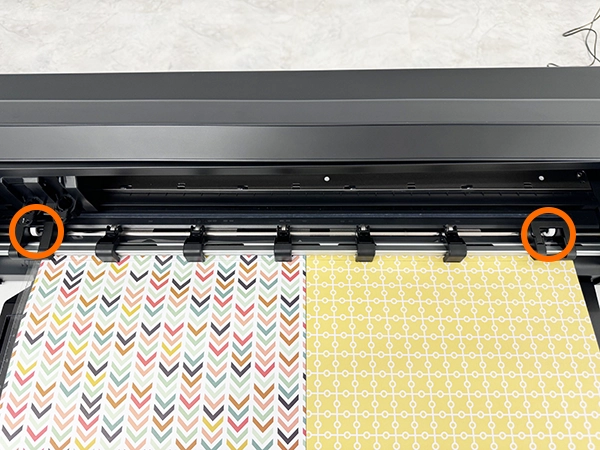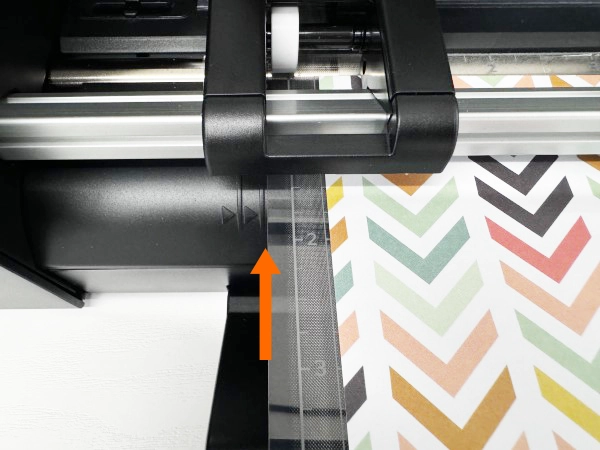 6. カッティング用台紙を左右に軽く引っ張りながら左端をガイドラインに合わせ、先端を左右のローラーにまっすぐ押し当てます。