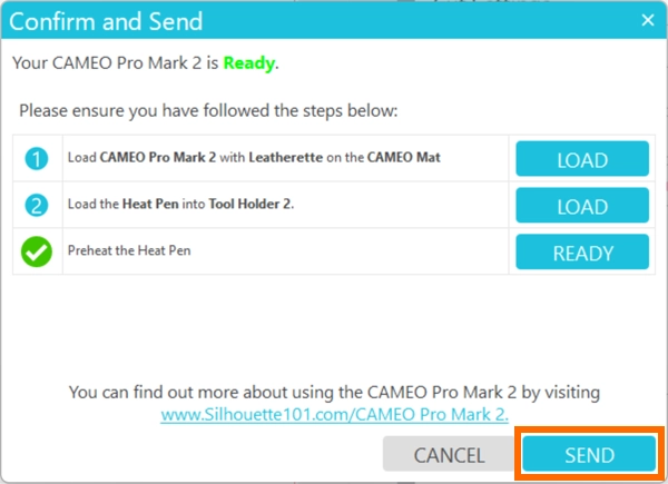 メディアをロードしたか、ヒートペンをセットしたか、余熱が[レディ]になっているか確認し、[送信]をクリックすると箔押しが開始されます。