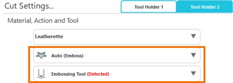 4. マシンとパソコンを接続するとエンボスツールが検出され、ツールホルダー2のアクションとツールに自動で表示されます。