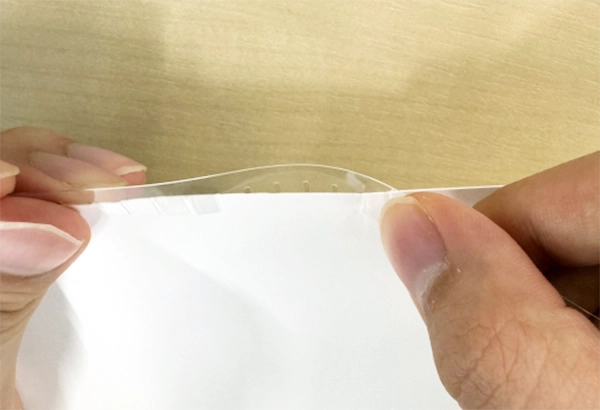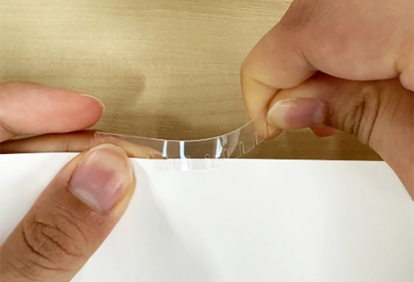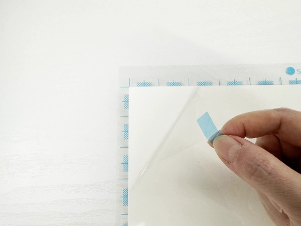 1. エンボス用台紙左上の青いタブをつまみ、透明フィルムを剥がします。