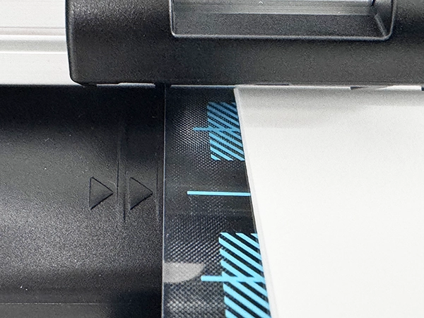 4. エンボス用台紙の左端をフロントパネルのガイドラインに合わせ、先端をピンチローラーに突き当てます。