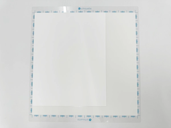 - メディアプレートを素材の4辺に取り付け、エンボス用台紙に貼り付けます。メディアプレートがエンボス用台紙の白いフォーム上に来るように配置してください。