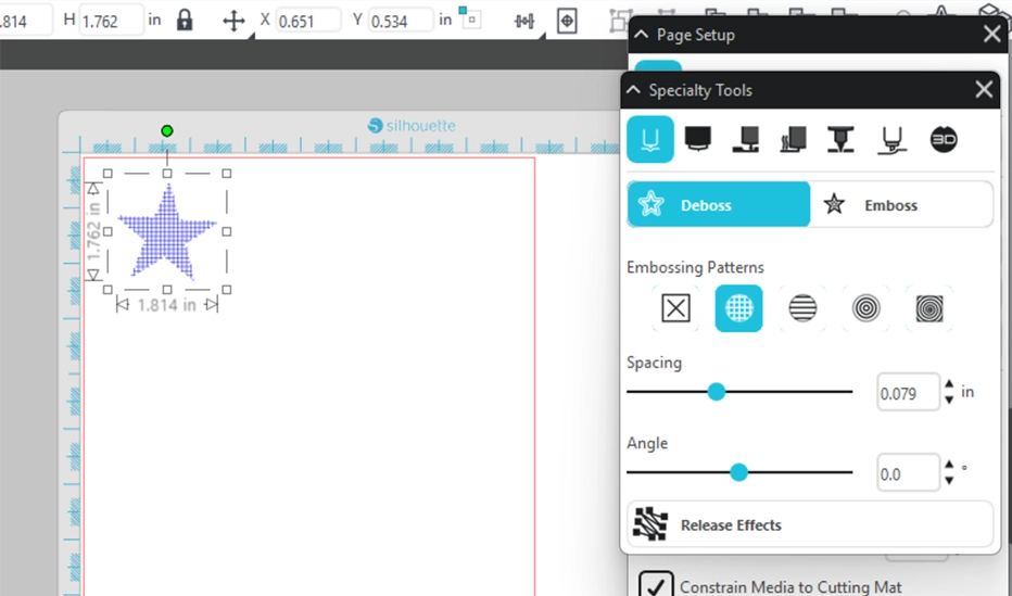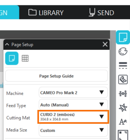 3. Silhouette Studioを開き、[ページ設定]から、カッティング用台紙を[CURIO 2(emboss)]に設定します。