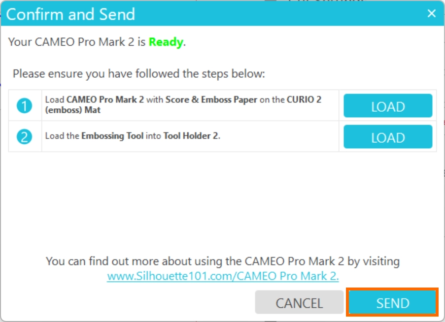 メディアをロードしたか、エンボスマットをセットしたか、ツールホルダー2にエンボスツールをセットしたか確認し、[送信]をクリックするとエンボス加工が開始されます。