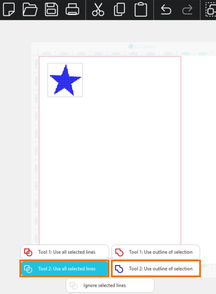 9. デザインをクリックして青い図形のアイコンの「選択したすべての線を使用」または「選択範囲のアウトラインを使用」を選択します。