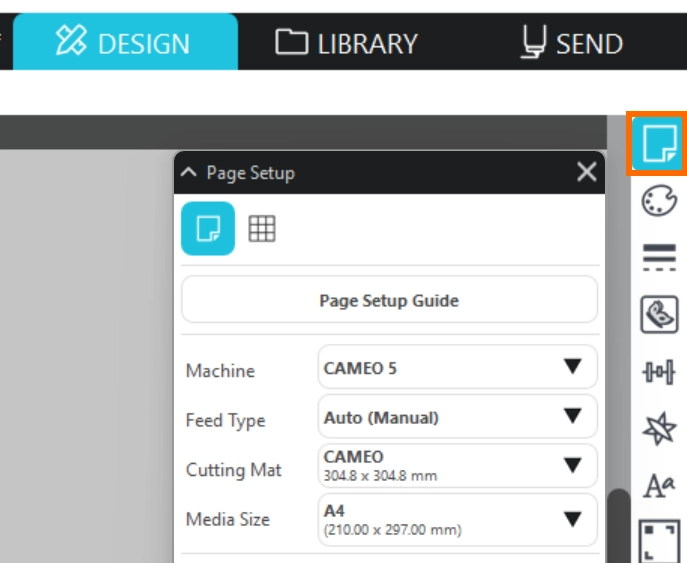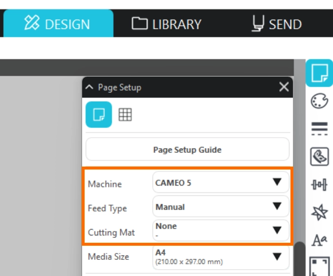 2. [デバイス]-[CAMEO5]、[フィードタイプ]-[マニュアル]、[カッティング用台紙]-[なし]に設定します。