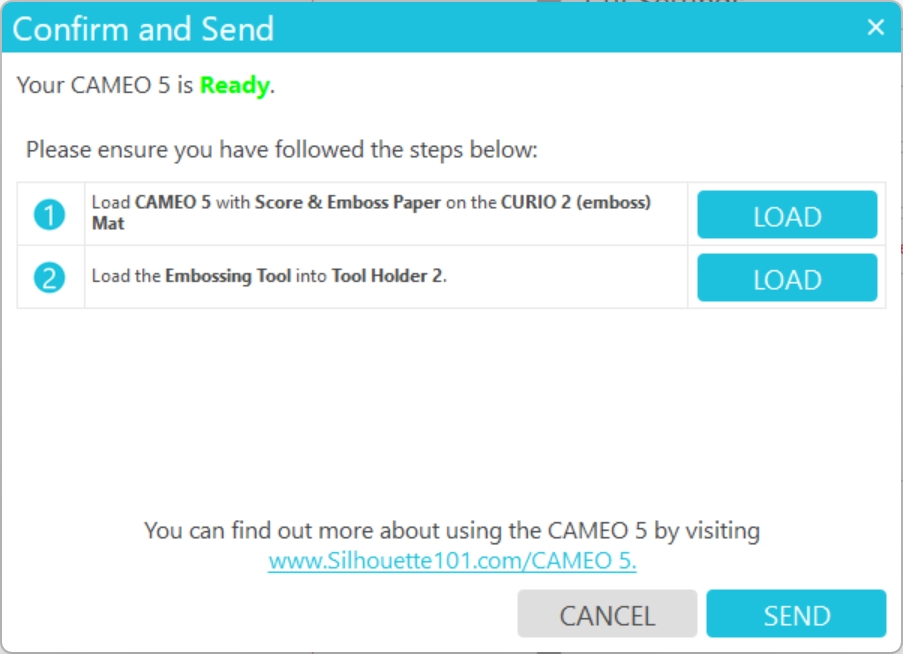 メディアをロードしたか、エンボスマットをセットしたか、ツールホルダー2にエンボスツールをセットしたか確認し、[送信]をクリックするとエンボス加工が開始されます。