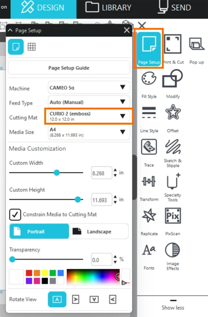 3. Silhouette Studioを開き、[ページ設定]パネルから、カッティング用台紙を[CURIO 2(emboss)]に設定します。