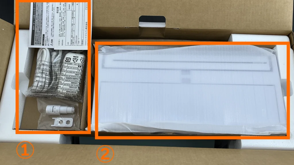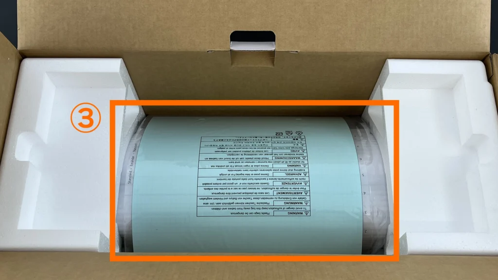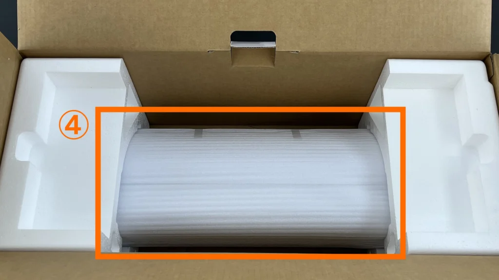 3. カバーを開き、各パーツを固定しているテープ(青色)、保護シート(2枚)、緩衝材(2個)を取り外します。
