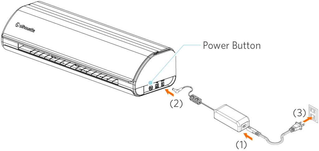 5. CAMEO5を電源に接続します。下図に示す番号(①~③)の順に電源ケーブルを接続してください。電源ボタンを2秒以上押してCAMEO5を起動します。