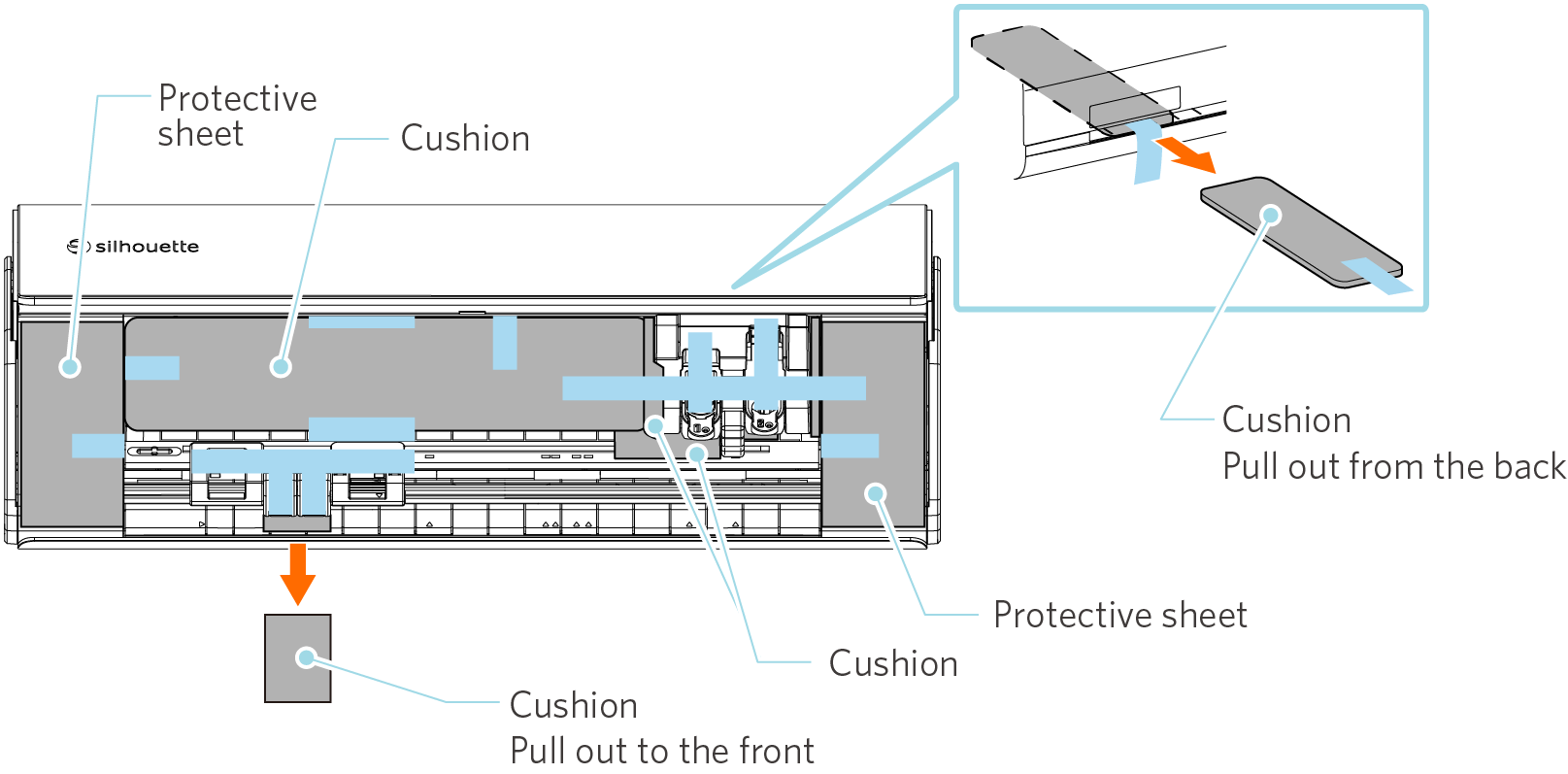 3. カバーを開き、各パーツを固定しているテープ(青色)、保護シート(2枚)、緩衝材(2個)を取り外します。