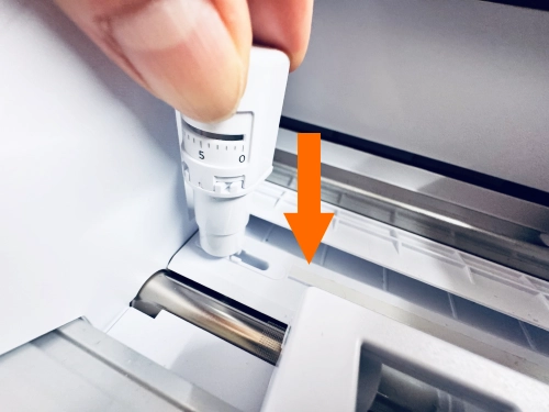 2. オートブレードを正面に向け、フロントパネルの刃出し調整ソケットに深く押し込んで刃を引っ込めます。