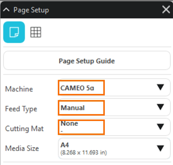 2. [デバイス]-[CAMEO5α]、[フィードタイプ]-[マニュアル]、[カッティング用台紙]-[なし]に設定します。