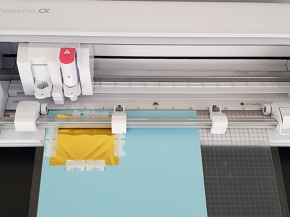 3. 箔押ししたい素材をカッティング用台紙に貼り付け、その上にデザインの大きさに合わせてカットした箔を乗せます。