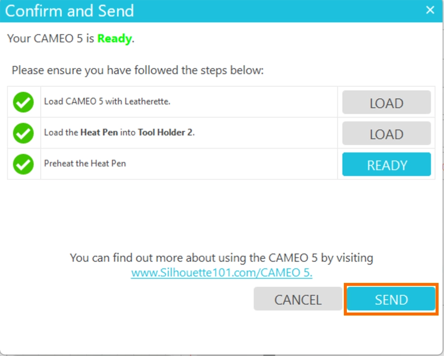 メディアをロードしたか、ヒートペンをセットしたか、余熱が[レディ]になっているか確認し、[送信]をクリックすると箔押しが開始されます。