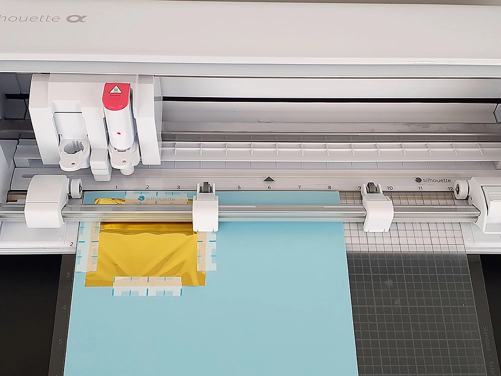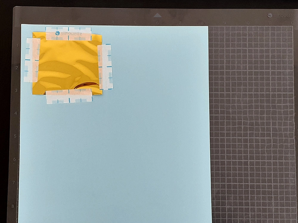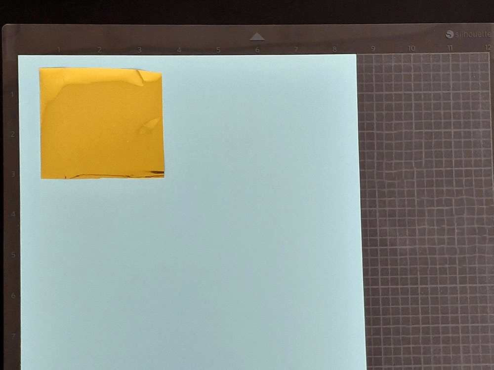 9. 箔押ししたい素材をカッティング用台紙に貼り付け、その上にデザインの大きさに合わせてカットした箔を乗せます。