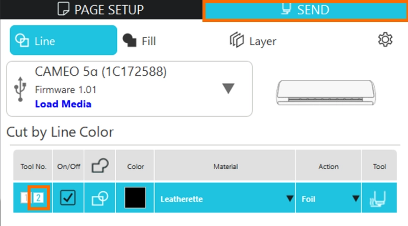 4. Silhouette Connectを起動します。[送信]パネルを開き、ツール番号2を選択します。