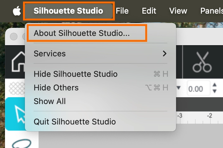 7. 現在使用しているソフトウェアのバージョンやエディションを確認するには、Silhouette Studioメニューの[Silhouette Studioについて]をクリックします。