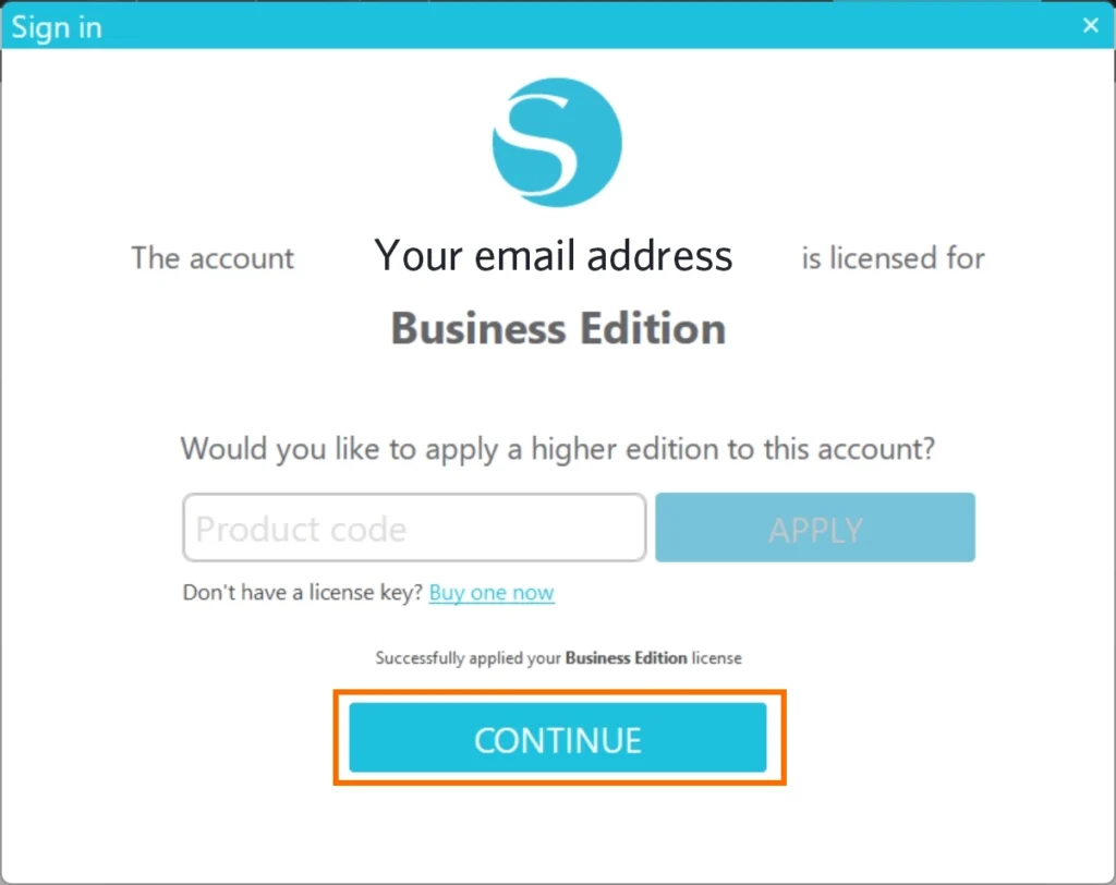 5. 適用されたエディションが適切か確認し、[継続]をクリックします。
