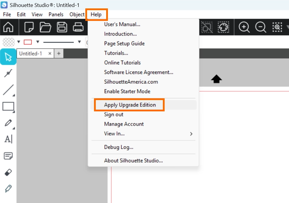 1. Silhouette Studioを起動し、ヘルプメニューで[Upgrade Editionを適用]をクリックします。