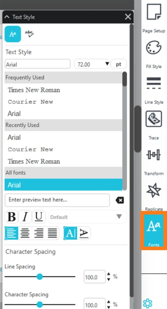 文字の入力にはお使いのコンピューターにインストールされているフォント(TTFおよび一部のOTF)を使用することができます。