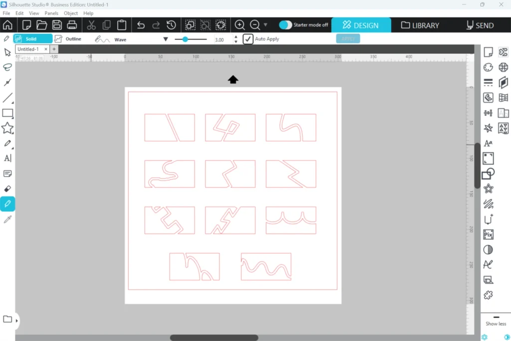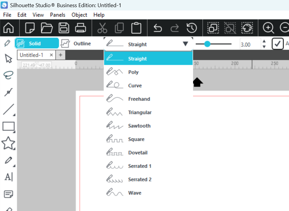 Silhouette Studioのアップグレード版(デザイナーエディション、デザイナーエディションプラス、ビジネスエディション)をご利用になる場合、ナイフツールを使用する際に選択できる線の形状が4種類から11種類と大幅に増加します。
