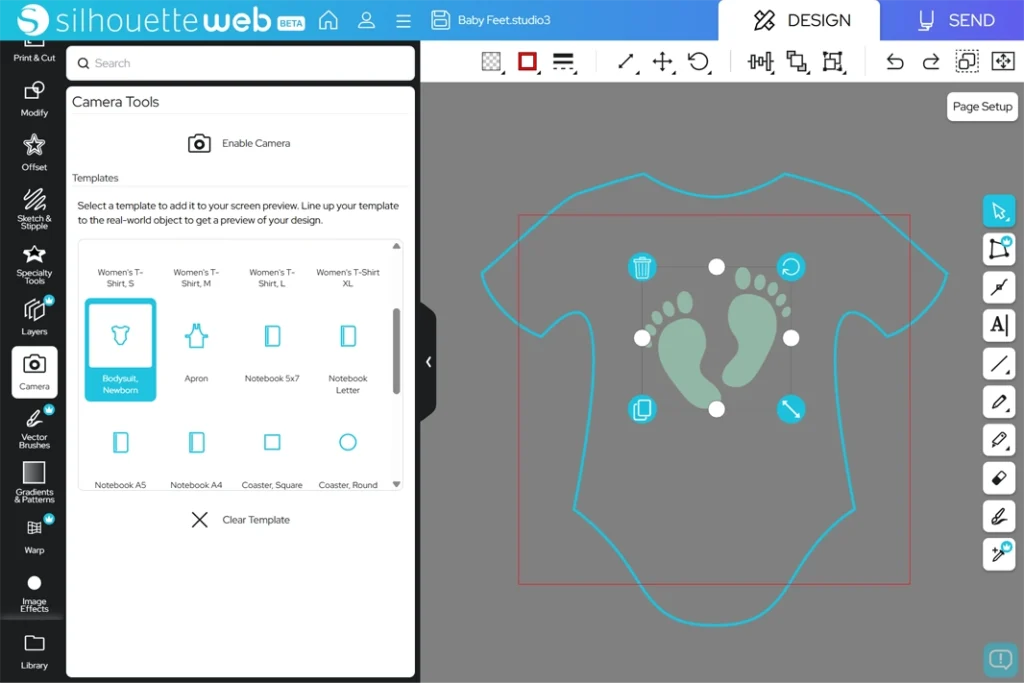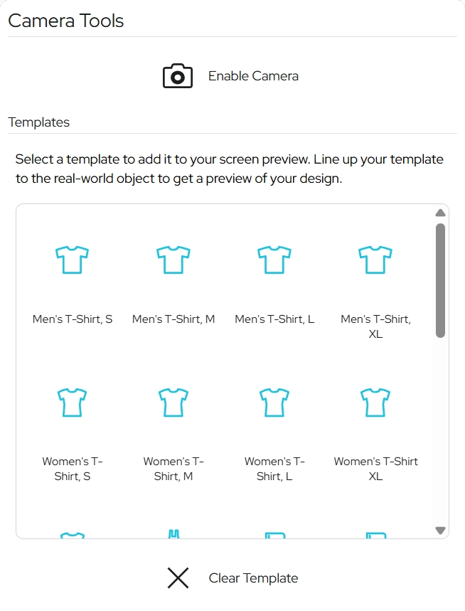 カメラパネルでは「レイアウトレンズ」機能を使用できます。これはテンプレートをデバイスのカメラ映像に重ねて表示し、デザインをプレビューできる機能です。