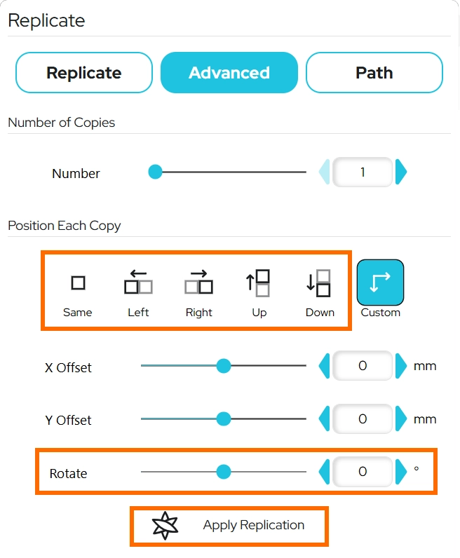 オブジェクトをどの位置に複製するかを指定できます。複製する位置を選択し、必要に応じて回転角度を指定したあとApply Replication(複製を適用)をクリックすると、オブジェクトがコピーされます。