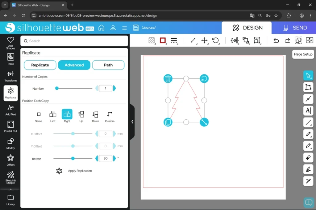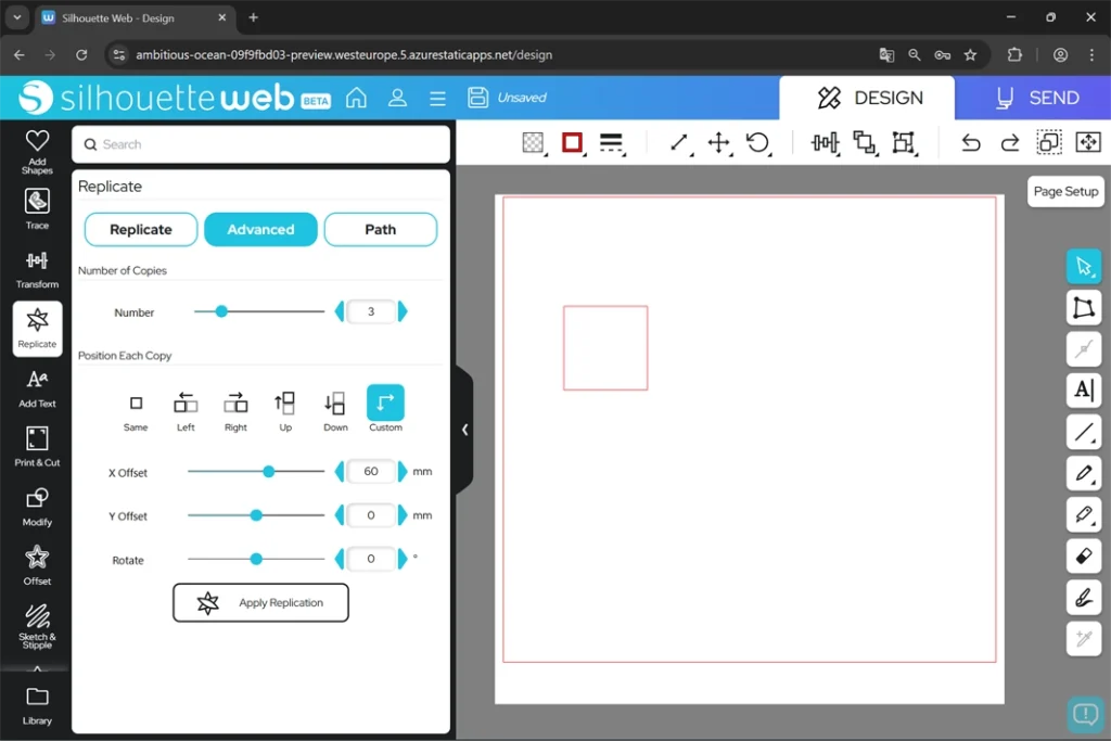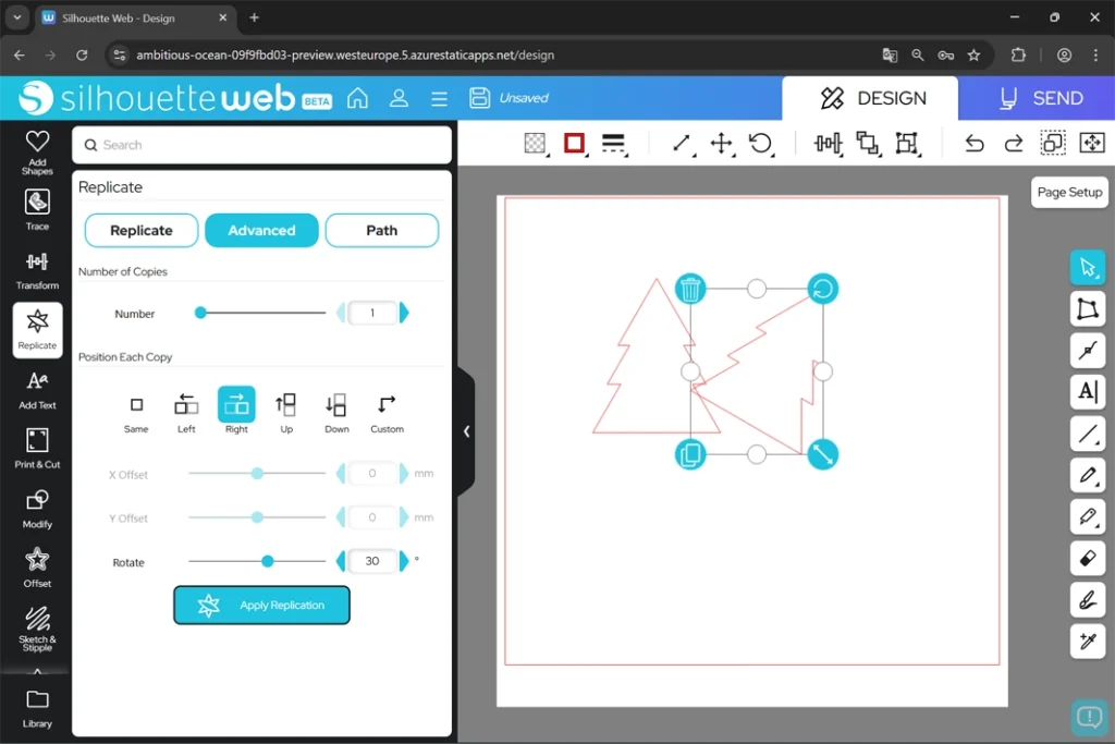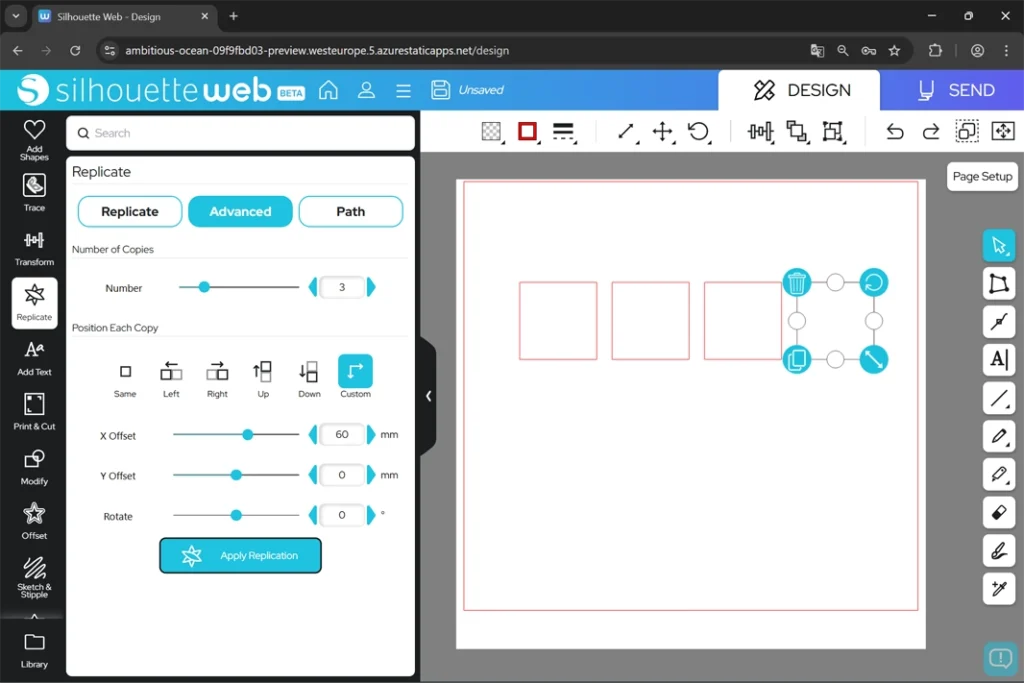 X Offset(Xオフセット – 横方向)やY Offset(Yオフセット – 縦方向)の距離や回転の角度を指定し、Apply Replication(複製を適用)をクリックすると、指定した位置にオブジェクトがコピーされます。
