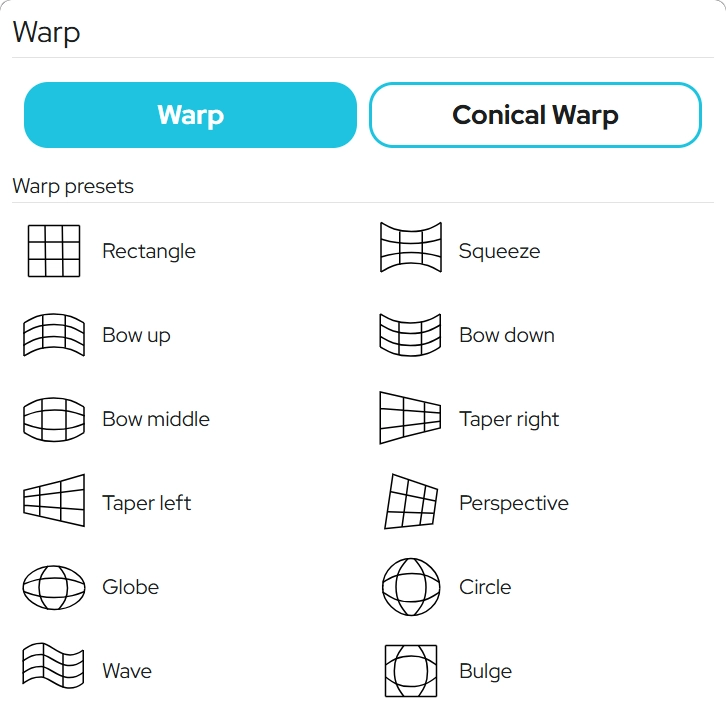 歪み加工パネルでは、オブジェクトやテキストを自由に変形します。曲げたり、絞ったり、膨らませたりと、立体感や動きを加えることができます。