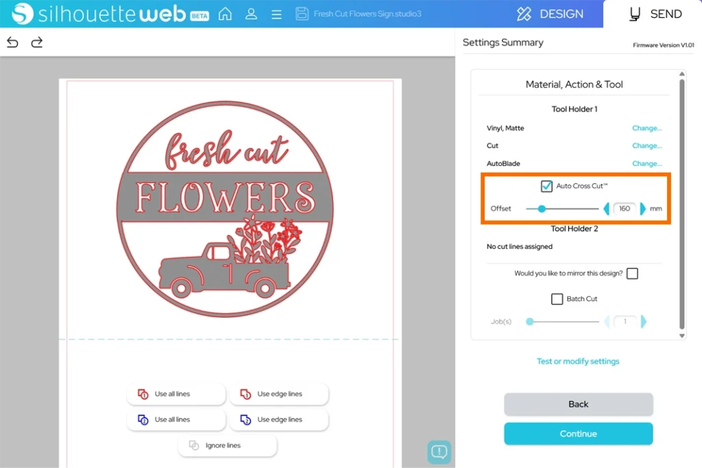5. 「Auto Cross Cut(オートクロスカット)」にチェックを入れ、オフセット距離を指定します。
