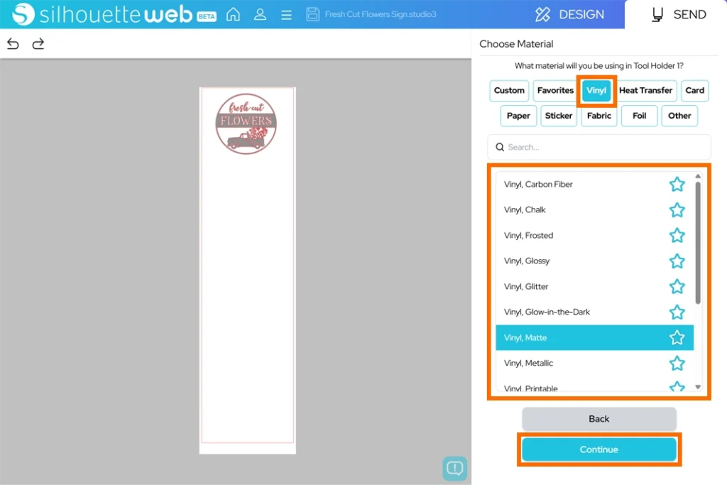 2. メディアタイプで「Vinyl(ビニール)」を選択し、リストの中から種類を選択します。選択したら「Continue」をクリックします。