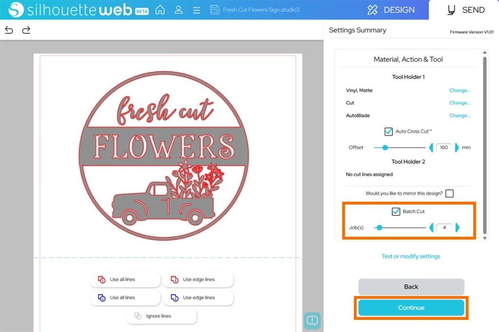 6. 「Batch Cut(一括カット)」にチェックをいれ、カット回数を指定します。カット回数を指定したら「Continue」をクリックします。