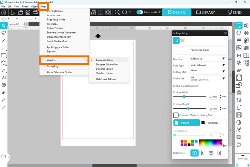 Silhouette Studio デザイナーエディション以上のアップグレード版をご利用いただいている場合、使用するエディションを切り替えることができます。