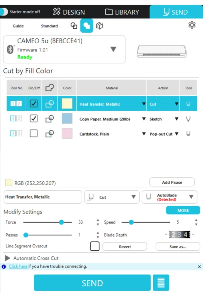 5. 選択した色やレイヤーの刃出し量やカット圧などは、下部で設定することができます。